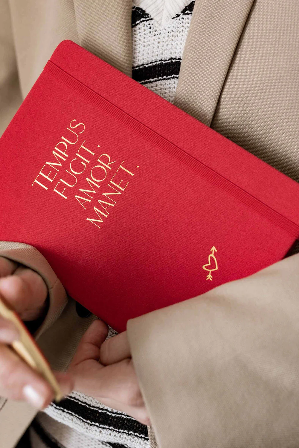 "Tempus fugit, Amor manet" is Latin and means time passes, love remains forever! Our new beautiful notebook in red with gold embossing - a definite eye catcher for every desk and/or handbag when on the go.Â