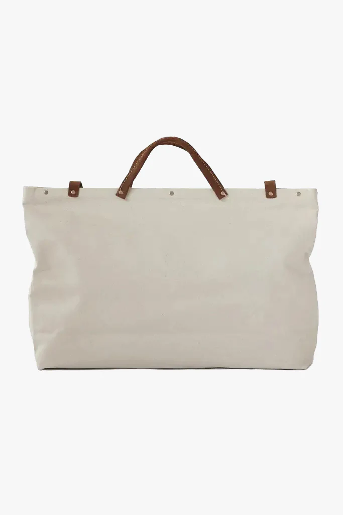 The ForestboundĀ BEACH Canvas Utility Bag is made from sturdy 18oz beige canvas. Features split leather handles and buckle straps with metal hardware. Also features metal feet on the base of the bag, a water resistant fiberboard interior bottom panel, and 12 gauge rivet secured steel dowels at the top opening of the bag to provide a wide opening as well as a secure closure.