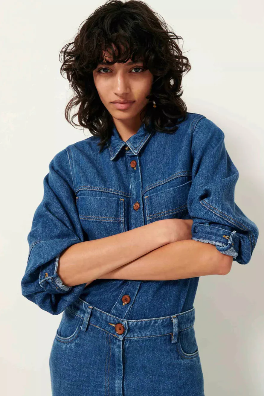 Overshirt with balloon sleeves in fluid stonewash denim woven in Spain.