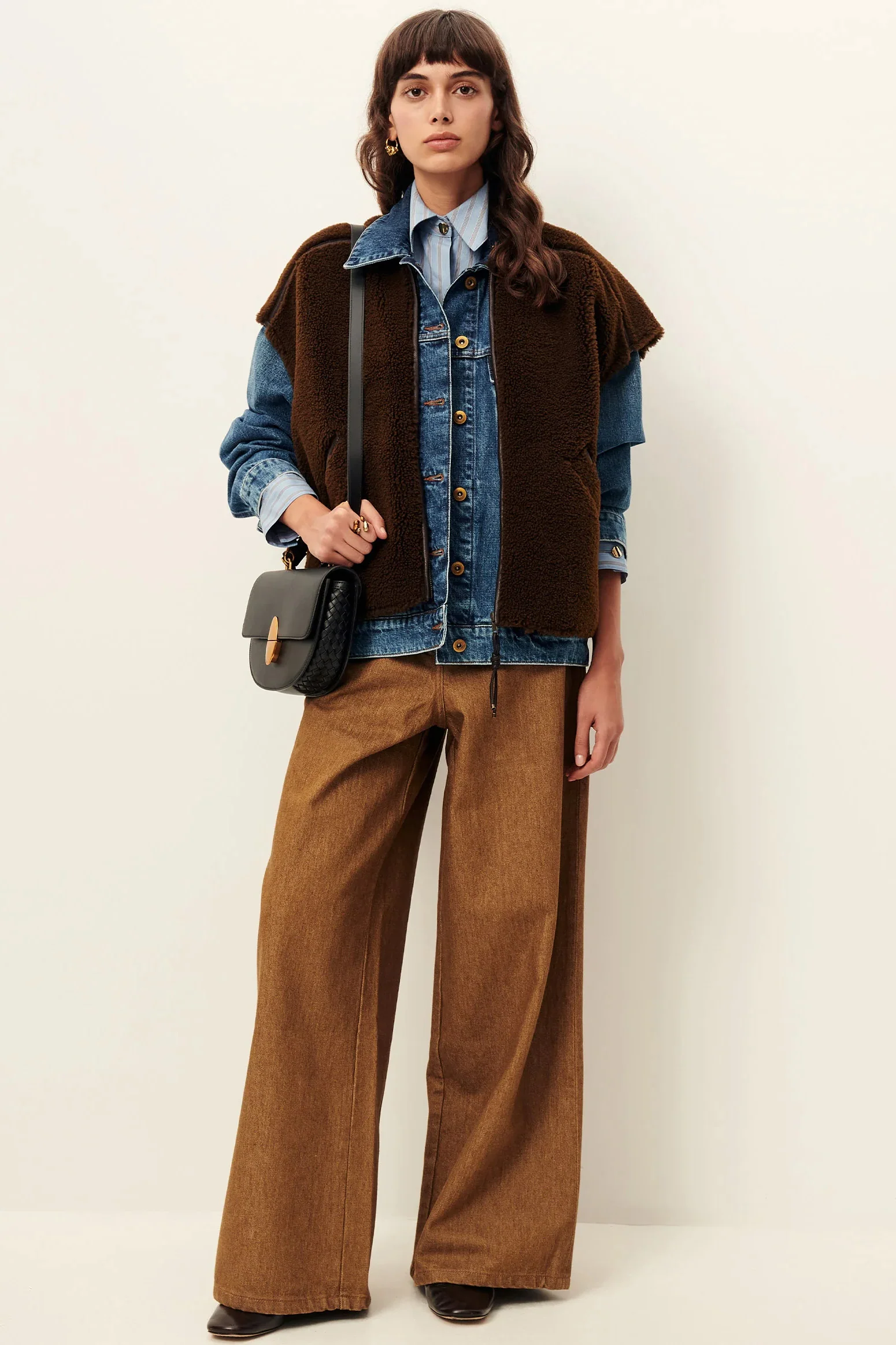 Sleeveless jacket in faux sheepskin effect double weave boucle yarn. Contrasting faux leather trimming.