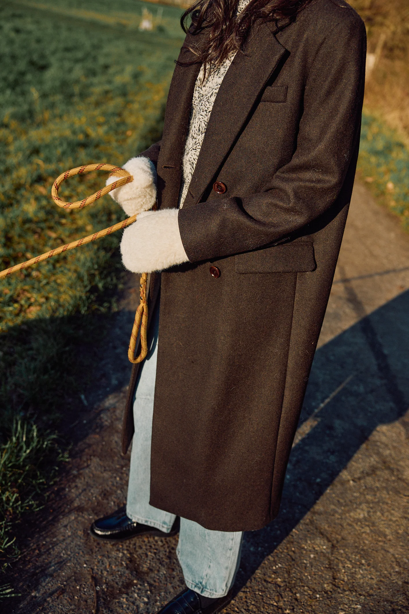 Long straight double-breasted coat with padded shoulders in wool twill fabric with two-tone heather-effect yarns, woven in Italy.