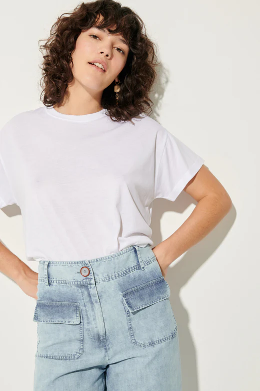 Short sleeves wide T-shirt in fluid simple knit fabric.